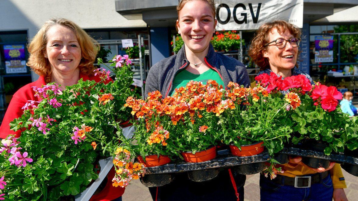 Beim Fensterblümlesmarkt auf dem Besigheimer Kelterplatz wechselten am Samstagmorgen rund 2000 Pflanzen ihren Besitzer. Auch der Wochenmarkt war diesmal wegen der Kirchstraßensanierung auf dem Kelterplatz, dazu gab es musikalische Untermalung von der Stadtkapelle Besigheim.